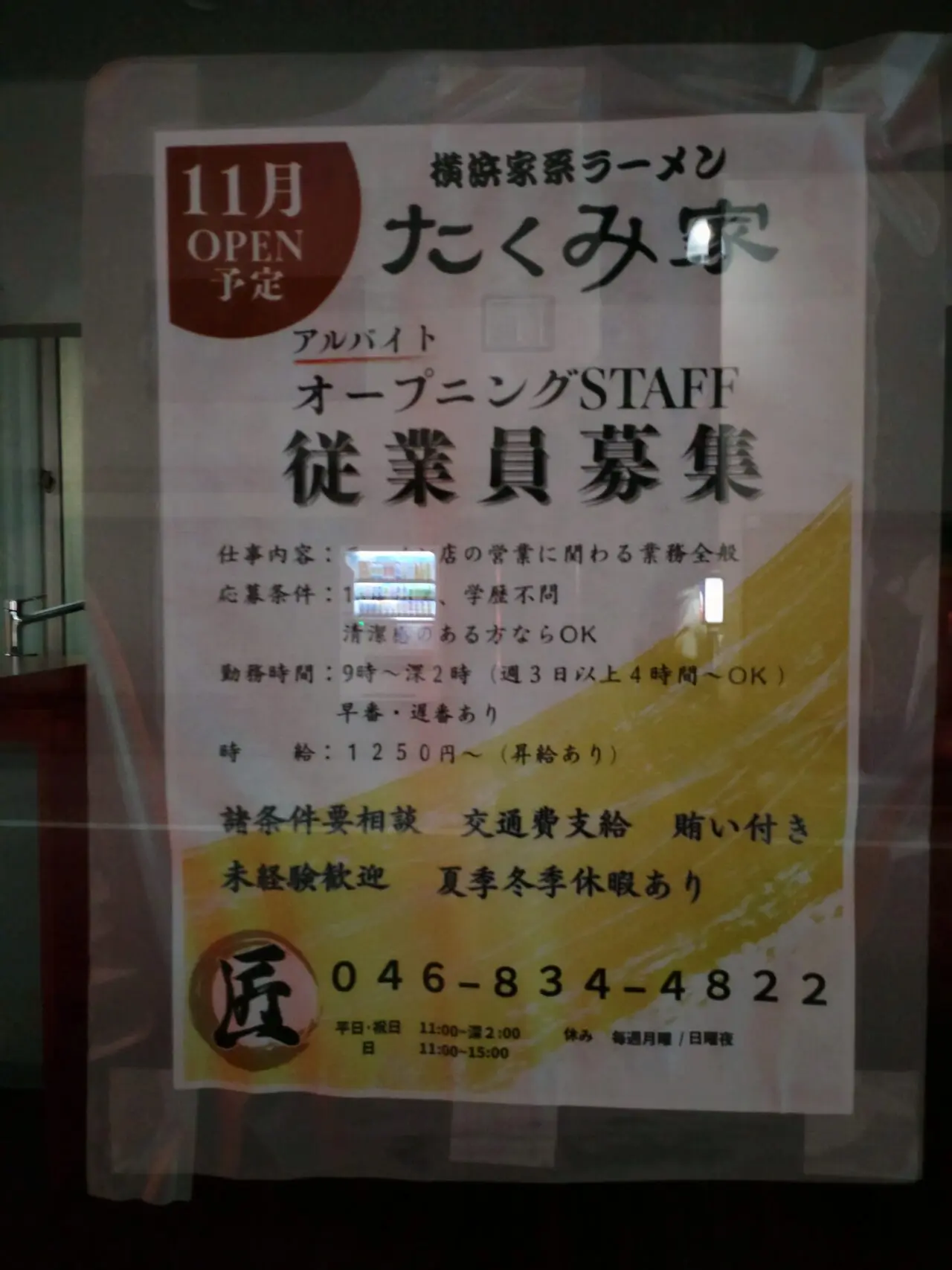 お店の名前は、「横浜家系ラーメン たくみ家」で、店舗の貼り紙には11月上旬オープン予定とのお知らせがありますが、インスタグラムには、2025年11月21日(金)オープン予定と記載がありました。