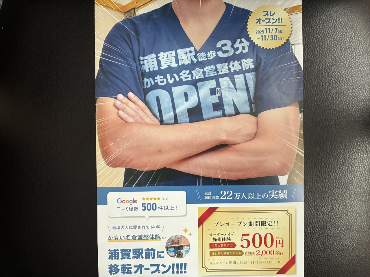 なお、グランドオープンに先立ち、プレオープン体験会にて、かもい名倉堂接骨院に初めて通われる方は500円で施術体験を受けることができます。