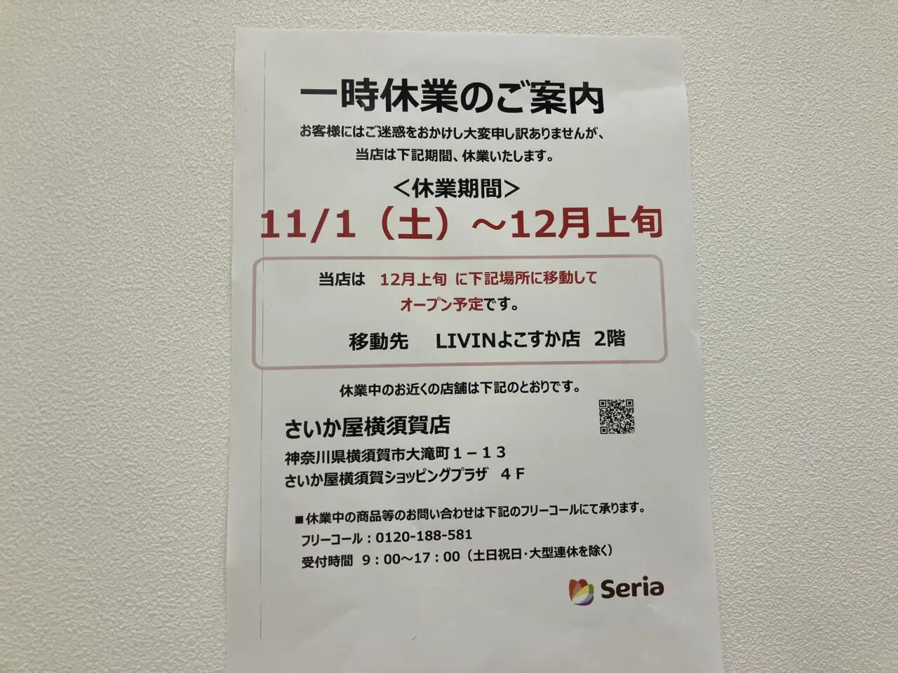 【横須賀市】リヴィンにある100円ショップ「Seria(セリア)」が、一時休業中です。