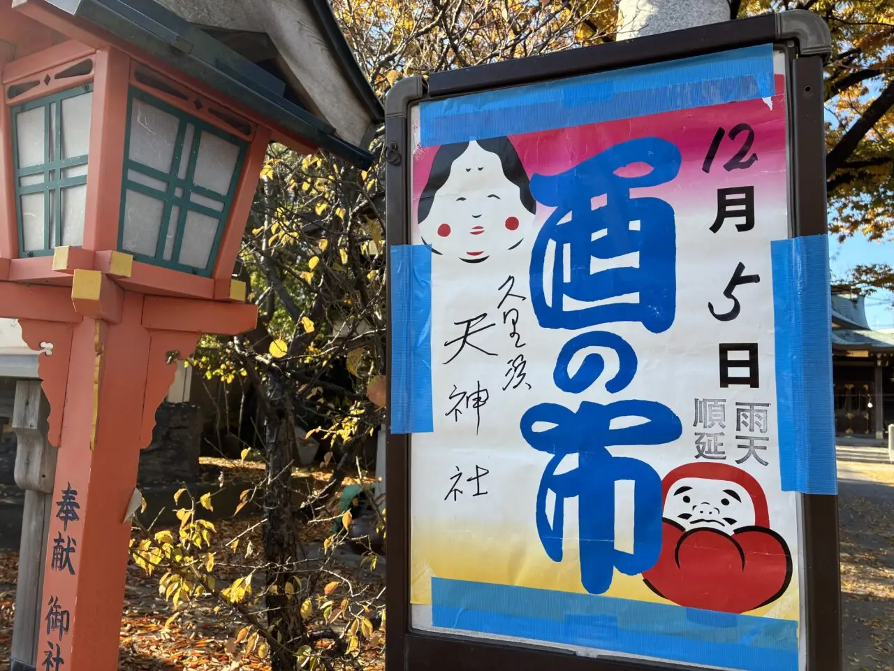 京急久里浜駅から徒歩5分の場所にある久里浜天神社では、毎年12月5日に「酉の市」が開催されています。
