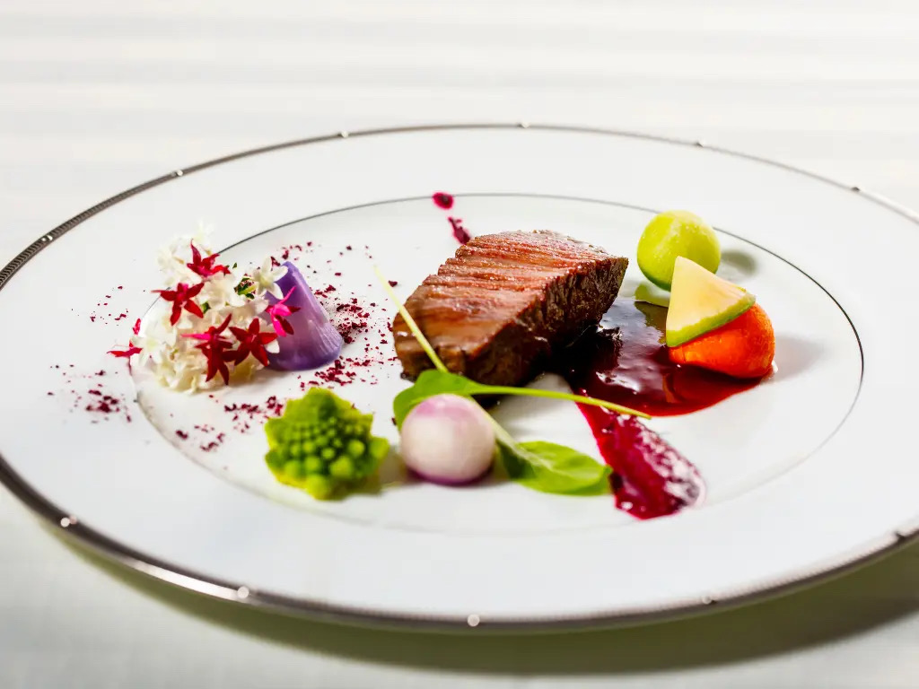 総料理長が厳選した三浦半島産の食材を用いた、クリスマスだけの特別なフルコースは、メインディッシュに、しっとりとした肉質が魅力の葉山牛サーロインステーキを。