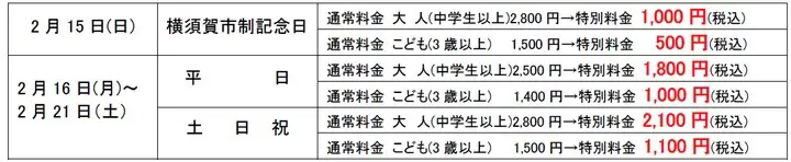 さらに2月15日(日)の横須賀市制記念日当日は、大人(中学生以上)1名様1,000円、子ども(3歳以上)1名様500円で入場することができます!