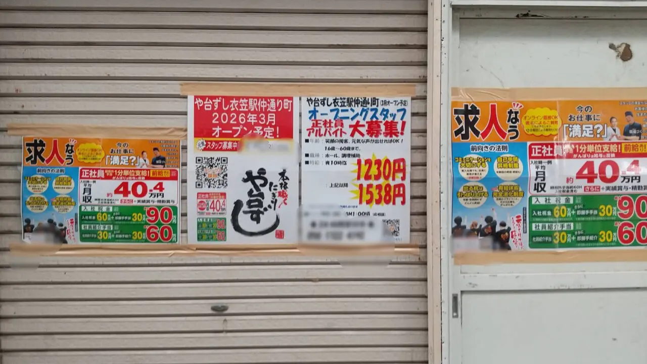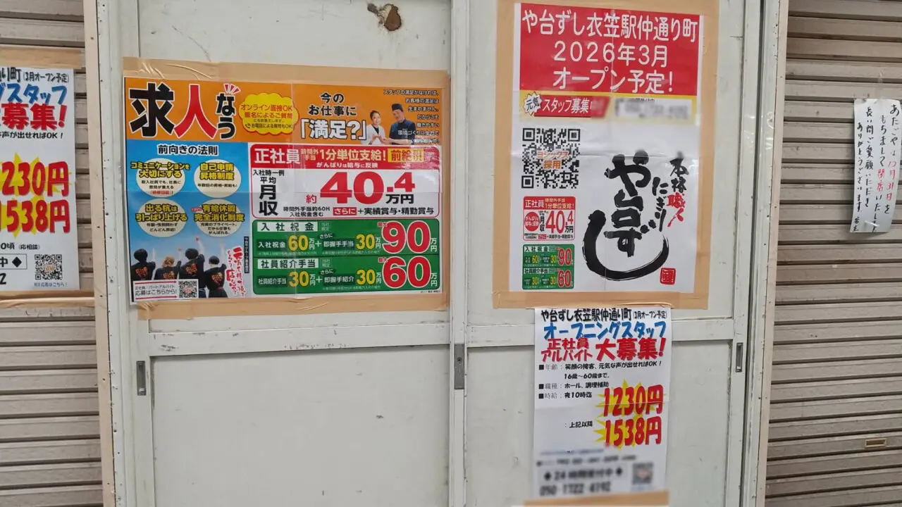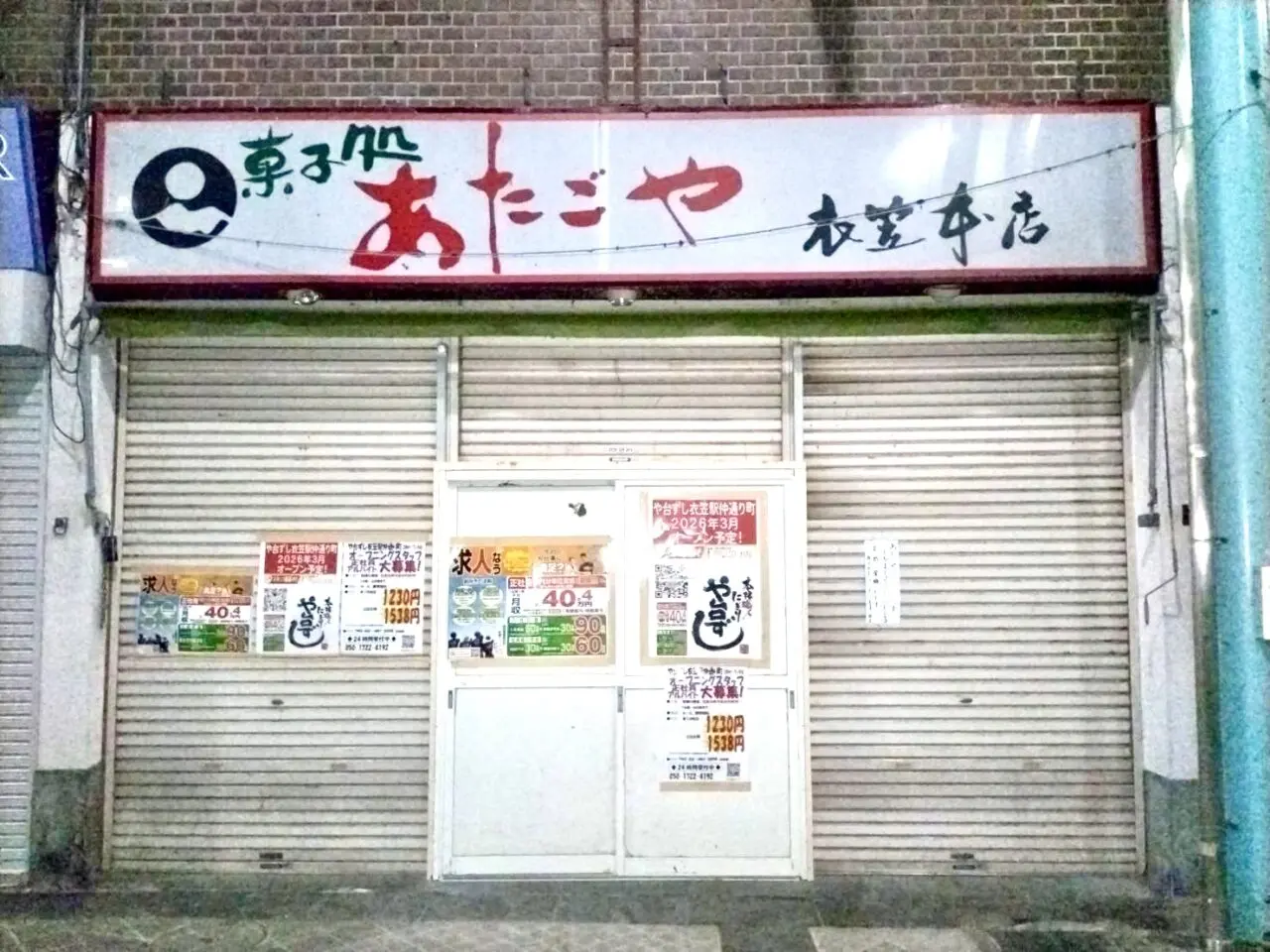 看板は、あたごやのままですが、シャッターには「や台ずし」のオープンのお知らせや求人情報の貼り紙があります。