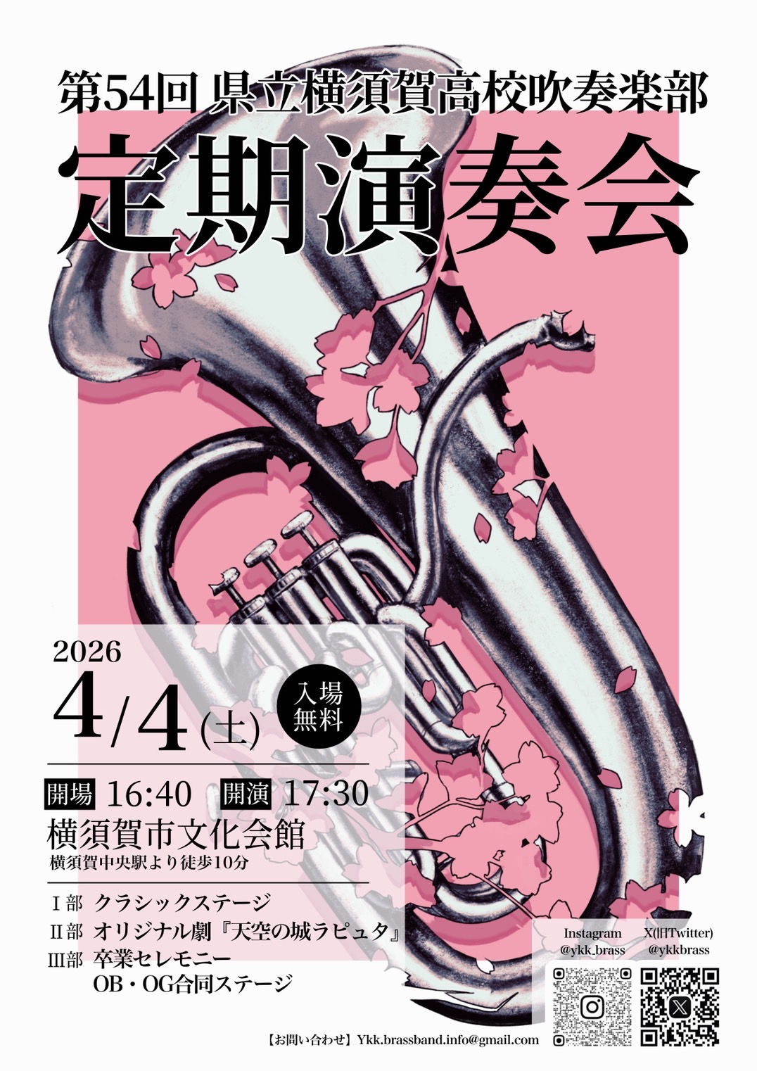 【横須賀市】どなたでも観覧無料!横須賀市文化会館にて、「神奈川県立横須賀高等学校吹奏楽部 第54回定期演奏会」が4/4に開催されます!