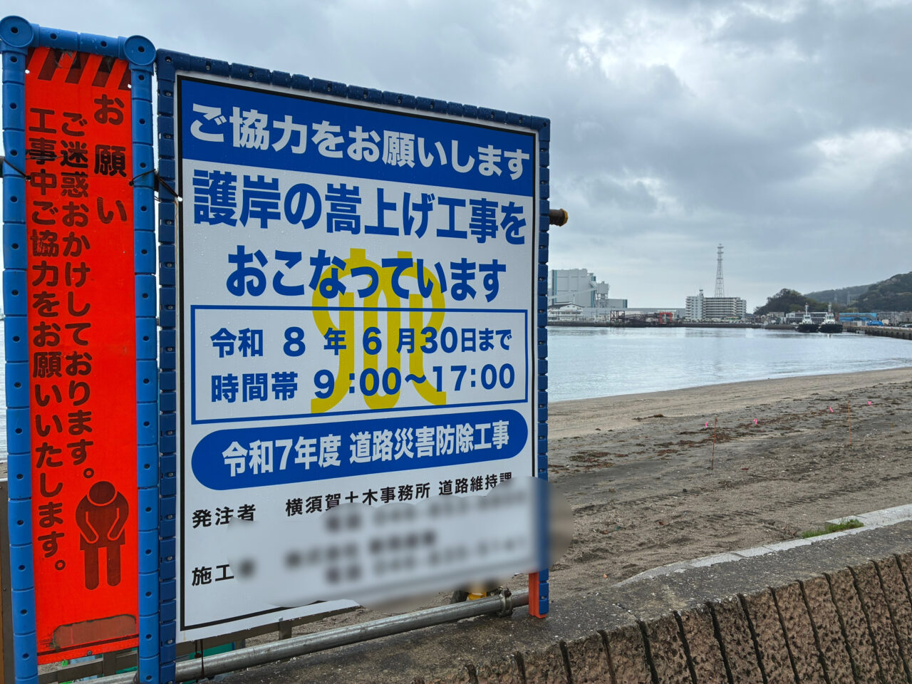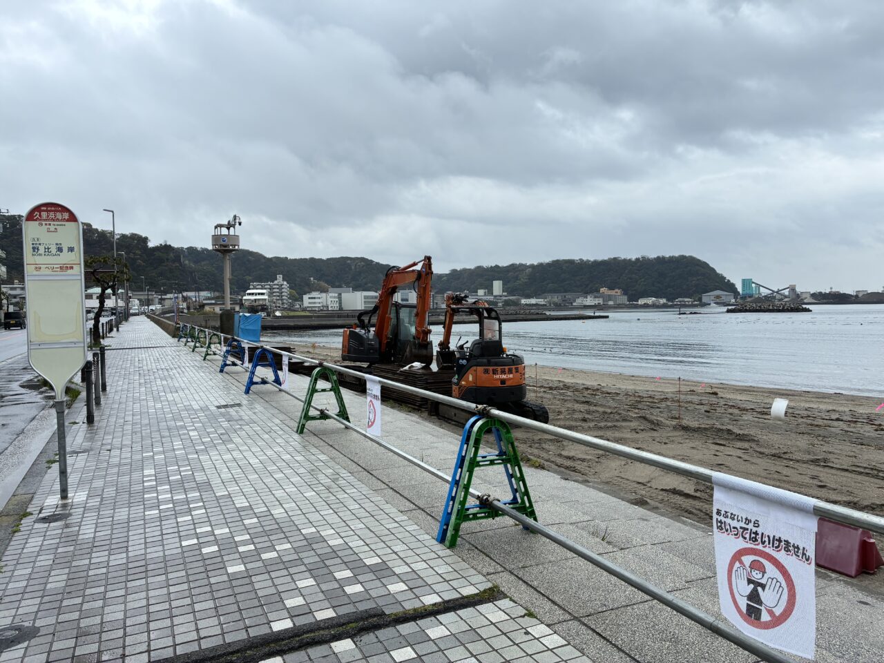 久里浜海岸にて、一部の砂浜が嵩上げ工事のため、2026年6月30日(火)まで使用できなくなっています。※工事時間は、9:00〜17:00です。